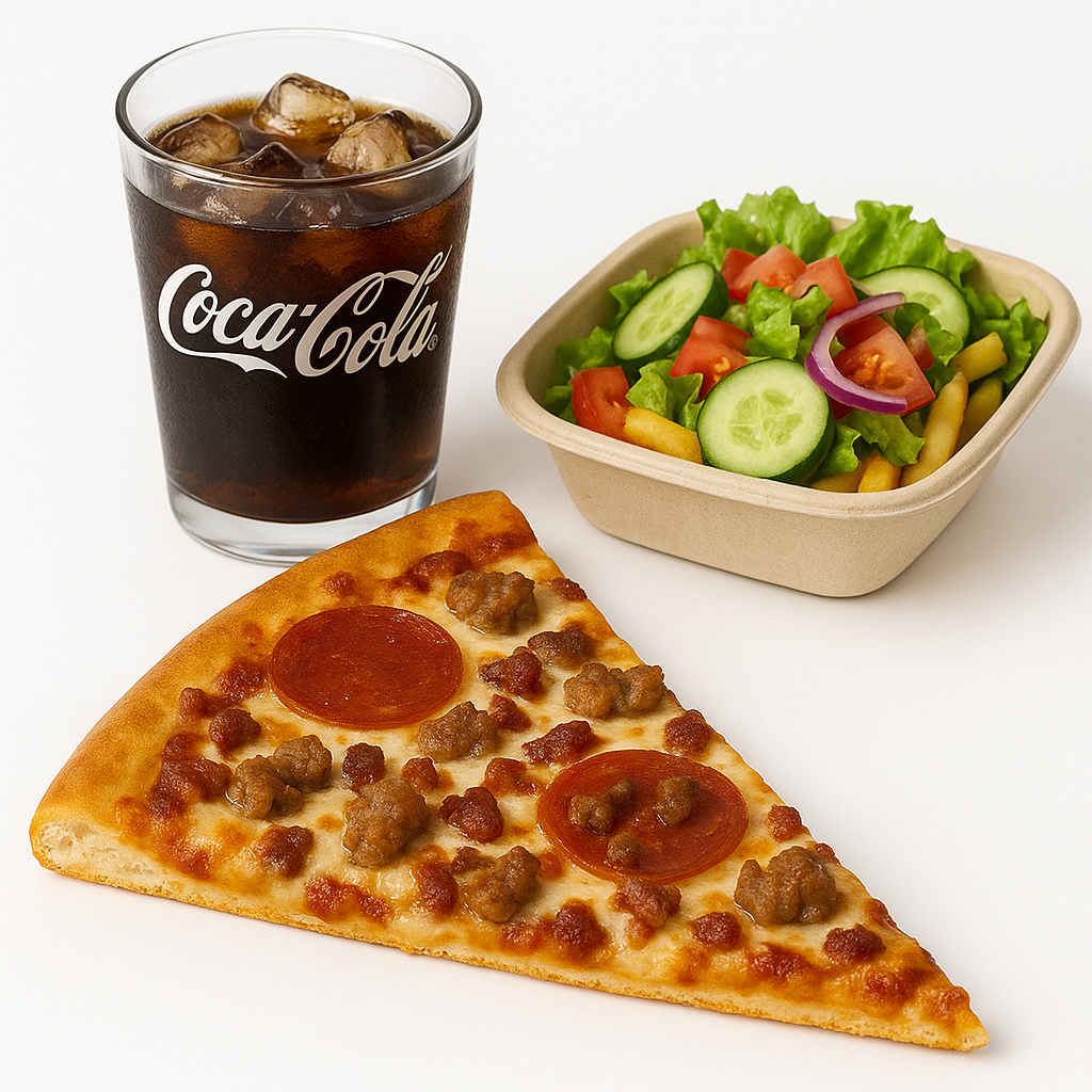 Består af 1 stk luksus hotdog med skrueformede pølse, chips salat og 1 drikkevare (cola, pepsi eller en flaske mineral vand)
